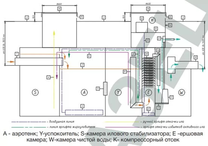 Следующий этап очистки после камеры Y происходит в отсеке Е – ершовая камера. В ней располагается ершовый фильтр-загрузка. Пропуская через себя переработанные канализационные стоки, он обрастает аэробными бактериями, которые производят глубокую биологическую очистку нечистот проходящие через этот фильтр-загрузку. Далее вода поступает в камеру очищенной воды W, из которой самотеком или принудительно, с помощью насоса, выводится наружу.